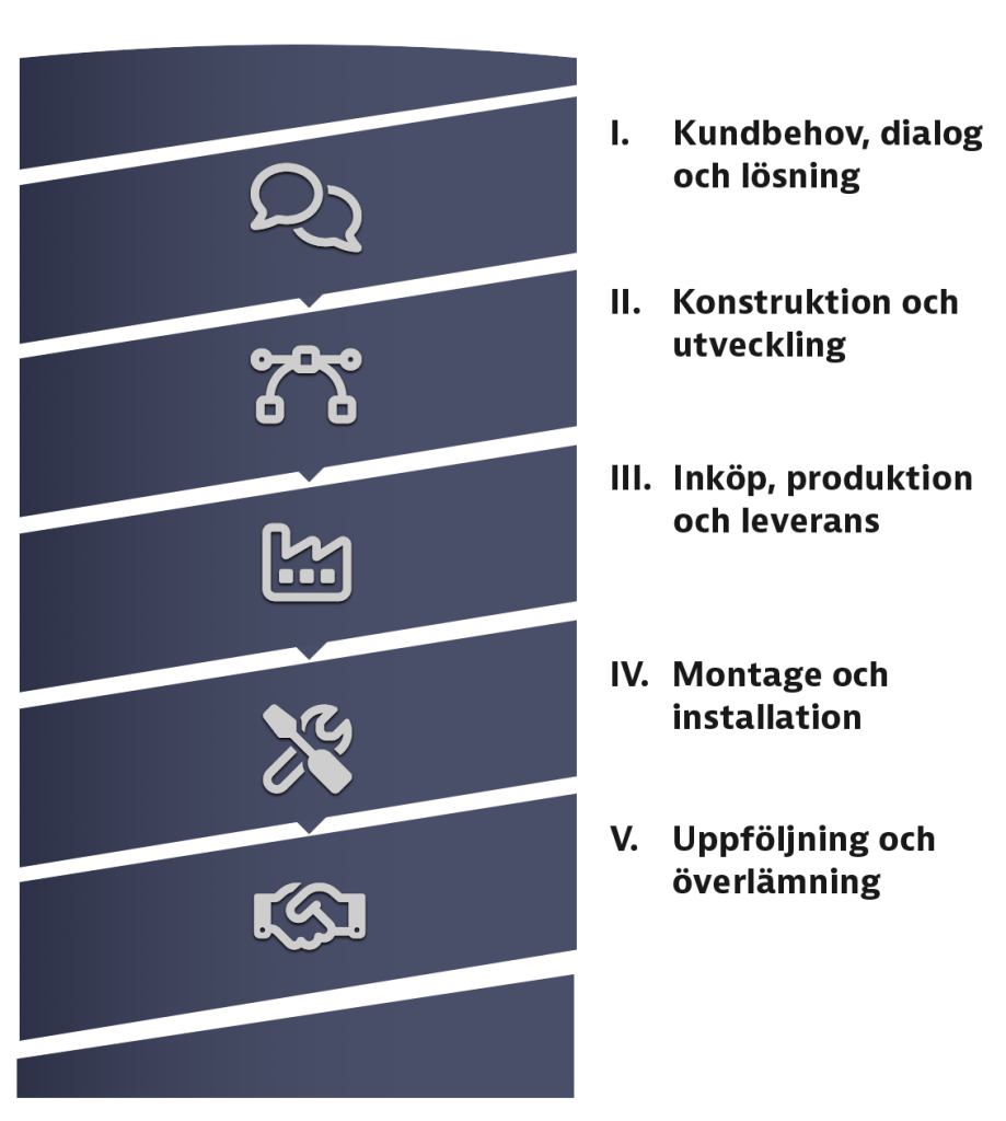 Eftersom de anläggningar vi bygger ska hålla länge, minst 20 år, har vi ett medvetet och strukturerat arbetssätt. Vi har delat in det i fem faser, som vi presenterar nedan. Ett projekt innehåller många delar och moment, så det gäller att vara noga i varje steg. Som tur är, har vi gjort det här sedan 1976, så vi har fått träna en hel del.